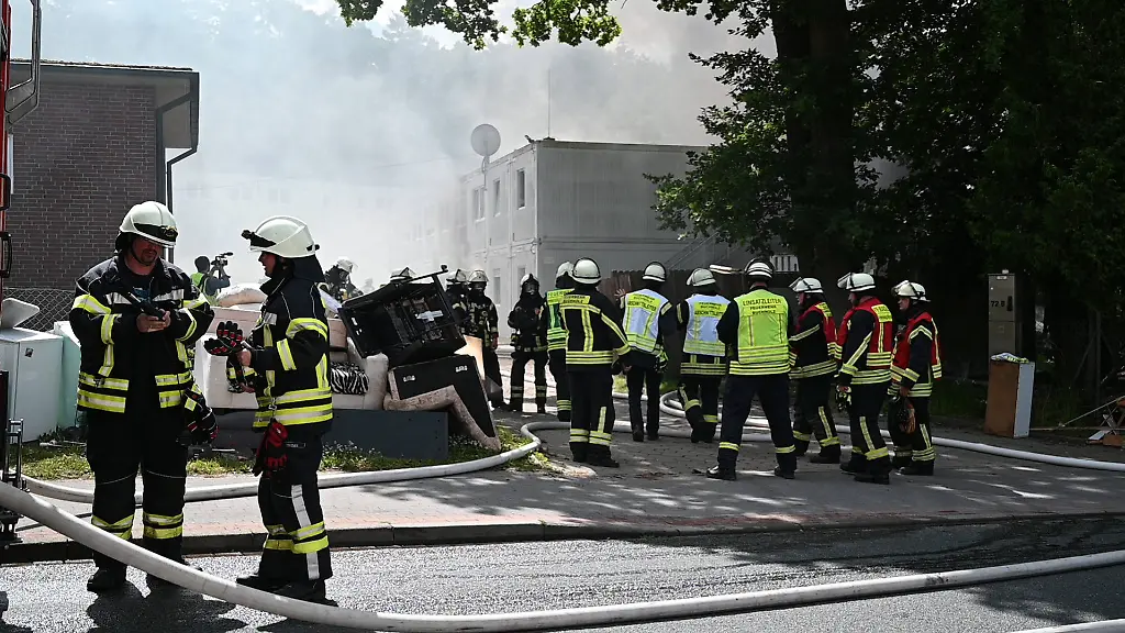 Zunächst habe es am Vormittag "Hinweise auf eine Brandgefahr" in der Bleibe für etwa 100 Menschen im Landkreis Harburg gegeben, hieß es in einer Mitteilung der Polizei. "Wir haben den Hinweis auf eine zündelnde Person bekommen", sagte ein Polizeisprecher. Zwei Beamte und zwei Mitarbeitende der Unterkunft hätten dann in einem Wohncontainer Benzingeruch wahrgenommen. Plötzlich sei es zu einer Explosion gekommen. Die Unterkunft mit insgesamt 48 Containern geriet in Vollbrand.