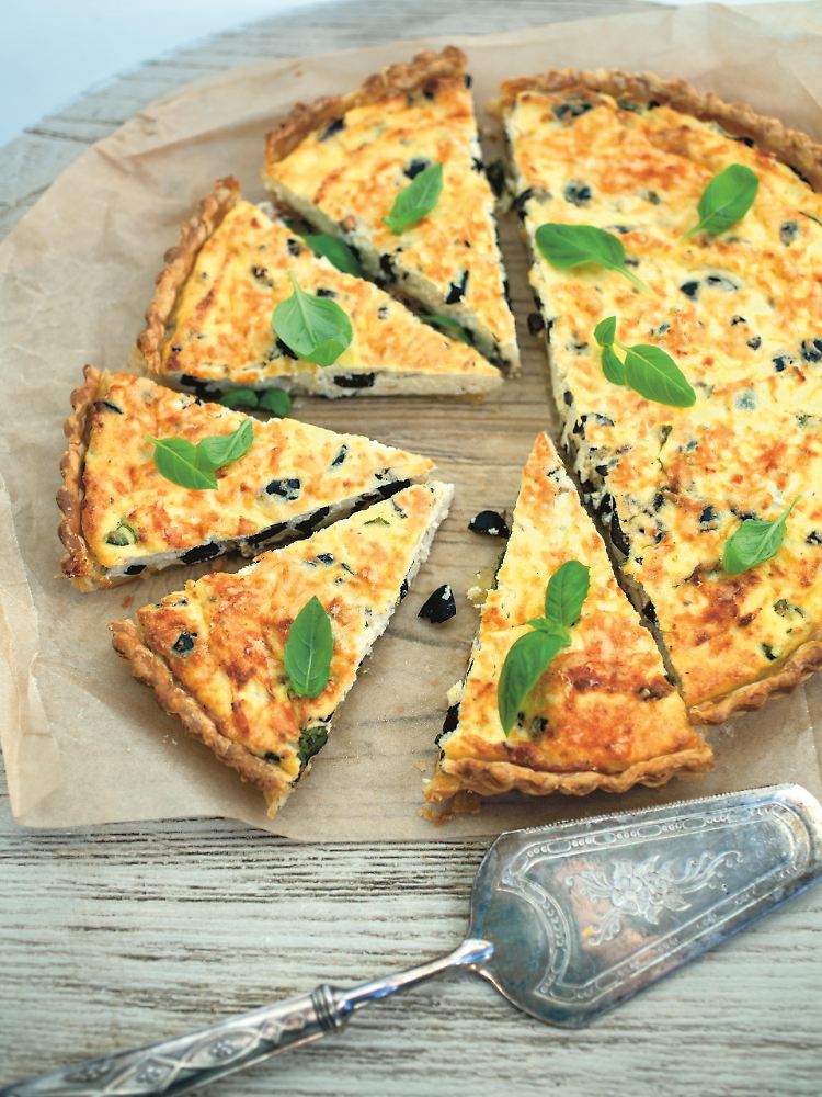 Tarte mit Ricotta, schwarzen Oliven und Basilikum