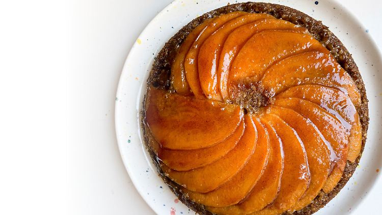 8. Eine flache Servierplatte mit der Oberseite nach unten auf die Pfanne legen. Beides zügig kopfüber wenden, sodass die Süßkartoffel-Tarte mit einem Ruck auf die Servierplatte fällt.