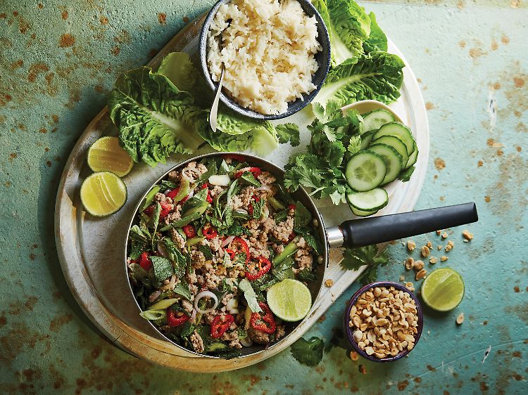3. Zum Anrichten ein mittelgroßes, hitzebeständiges Holzbrett verwenden, auf dem die Pfanne Platz findet. Den gegarten Reis in einer Schüssel auf das Brett stellen. Die Salatblätter und anderen Zutaten am Rand des Bretts arrangieren (die Erdnüsse in einer Schüssel) und abschließend die Pfanne mit dem heißen Larb in die Mitte stellen. Lassen Sie Ihre Gäste zugreifen, solange das Fleisch noch heiß ist.