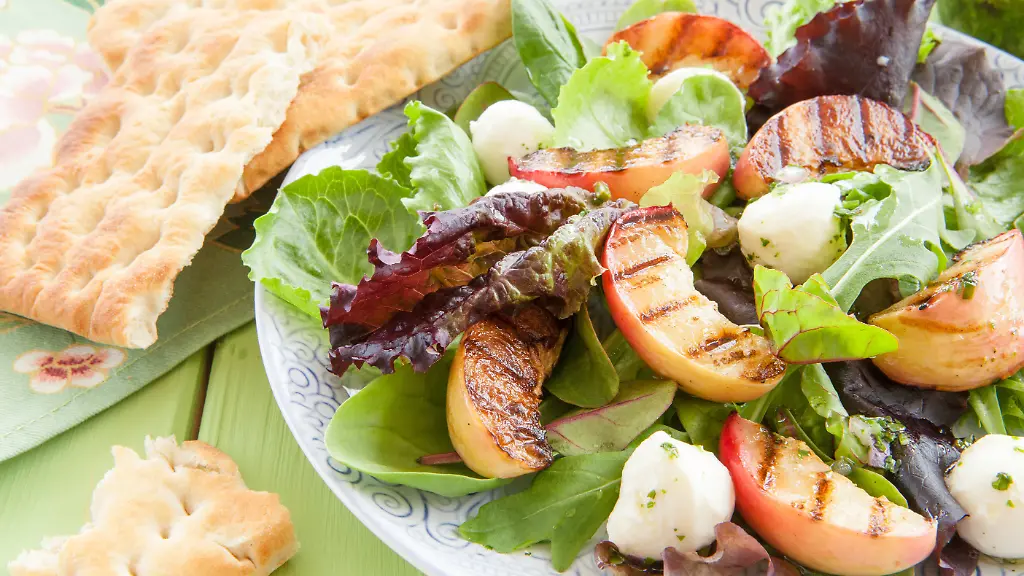 Eine gesunde Mischung aus grünen Salaten, gebratenen Pfirsichen und Mozzarella. (Foto: imago stock&people)