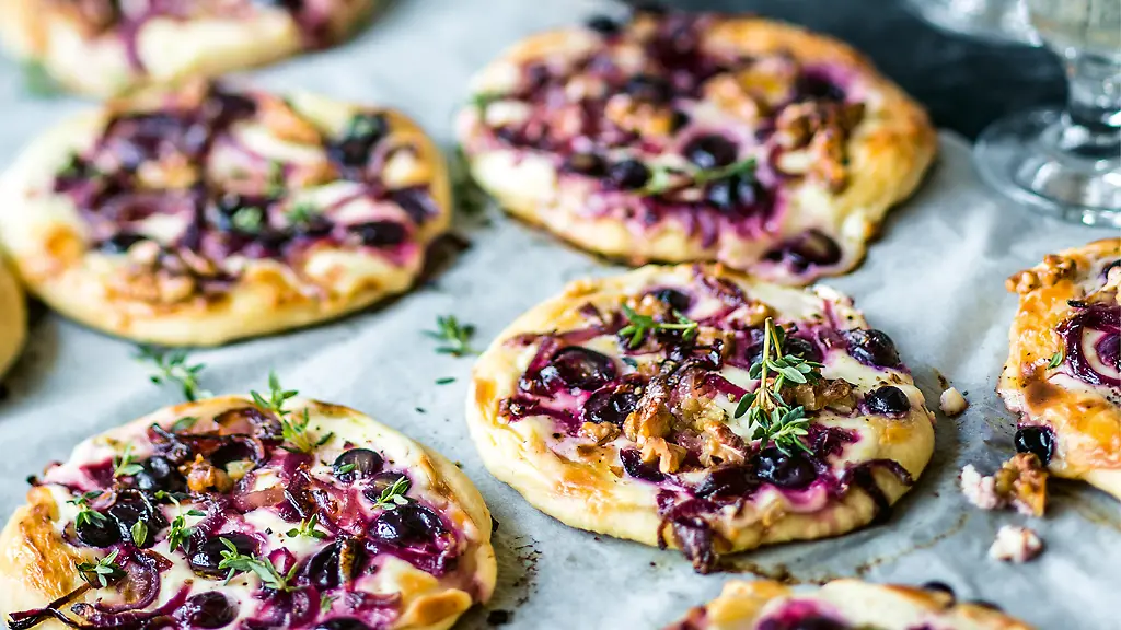 7. Die Teigfladen mit der Schmandcreme bestreichen und dabei einen kleinen Rand frei lassen. Mit Zwiebelstreifen, Weintrauben und Walnüssen belegen. Nach Belieben mit Thymian oder Kümmel bestreuen. Mit dem restlichen Olivenöl beträufeln.