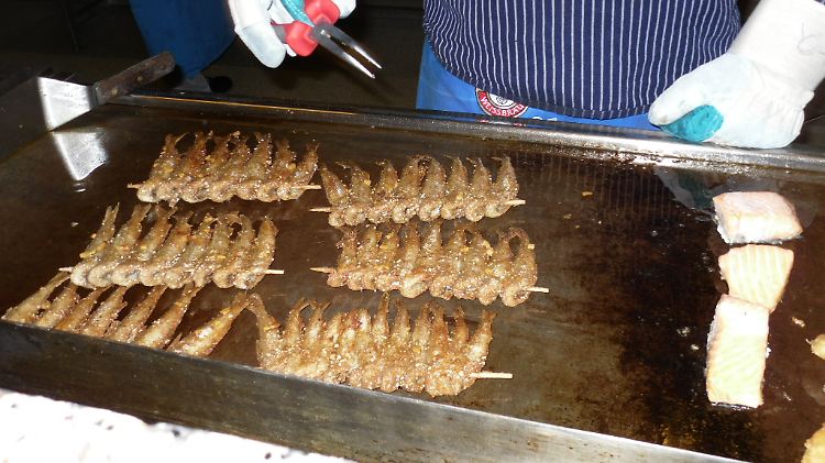 Der Stint wird mitunter "Gurkenfisch" genannt, weil er nach grünen Gurken riecht. Da muss man den Kopf allerdings richtig über eine Kiste mit frisch gefangenen Stinten hängen, denn gebraten riecht und schmeckt er nicht wie Gurken, sondern ganz lecker – wie ein Fisch halt schmecken muss. Wer mit Messer und Gabel am Stint herummurkst und versucht, die winzigen Filets zu sezieren, kommt sich schnell wie ein Vollpfosten vor: Stint wird seit Urzeiten mit der Hand in den Mund geschoben, die Gabel ist nur für den Kartoffelsalat oder die Bratkartoffeln. Und dann mit Genuss kauen; Mittelgräte und kleine Gräten sind so zart, dass sie nicht stören. Die Stinte werden traditionell in Roggenmehl gewendet und in Butter und Speck oder mal schlichter in Öl kross gebraten; Kopf und Innereien wurden vorher entfernt. Das Schwänzlein bleibt dran und ist das knusprigste Stück am Stint. Stinte gibt es auch geräuchert oder wie Bratheringe sauer eingelegt. Am besten haben mir allerdings die gebratenen Stinte geschmeckt, ich bin jetzt absoluter Fan! Bei den geräucherten habe ich dann doch die Hauptgräte entfernt, die krabbelte einfach zu sehr im Hals. Sie wird durch das Räuchern nicht so weich wie durch das Braten oder Marinieren.