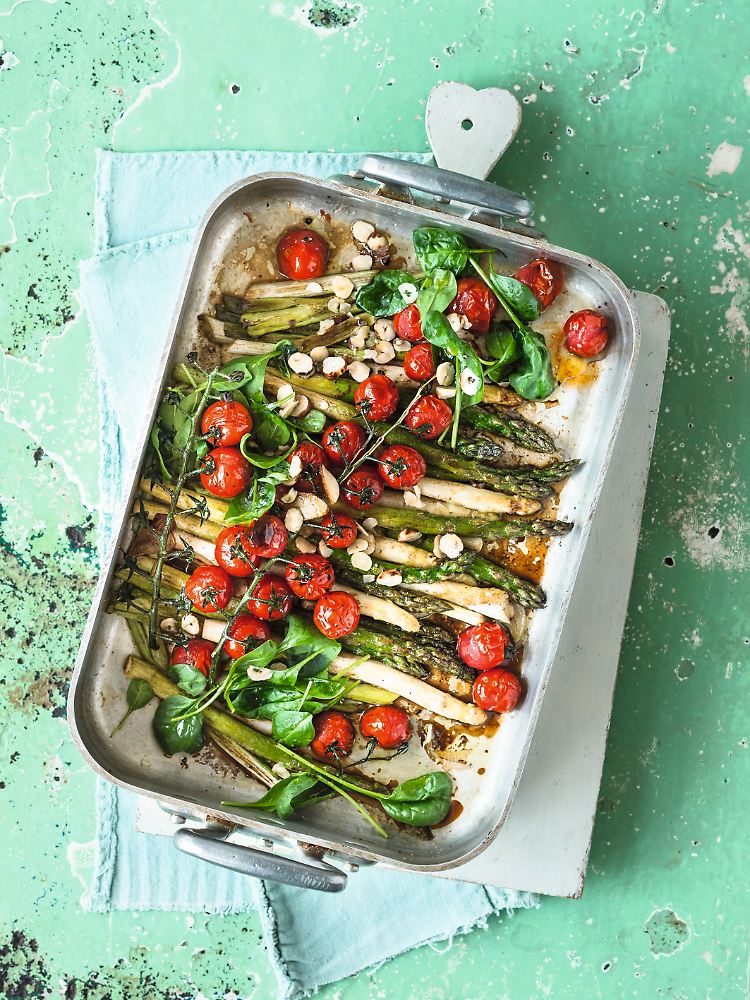 3. Tomaten mitsamt Rispen waschen, trocken tupfen. Restliches Öl in der Pfanne erhitzen und die Tomaten darin bei mittlerer Hitze ca. 3 Min. braten. Mit Essig ablöschen, salzen und pfeffern. Spinat waschen und trocken schleudern. Tomaten und Spinat zum Spargel geben, alles salzen und pfeffern. Mit den angerösteten Nüssen bestreut servieren.