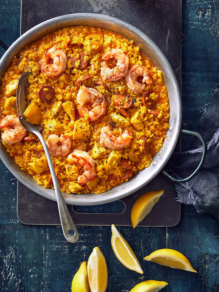 Bei der Paella mit Hähnchenbrust und Garnelen werden Urlaubserinnerungen wach.