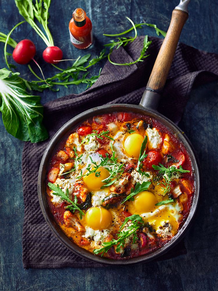 Inzwischen Rucola waschen und trocken schütteln. Die fertige Shakshuka mit Rucola bestreuen und am besten aus der Pfanne servieren.