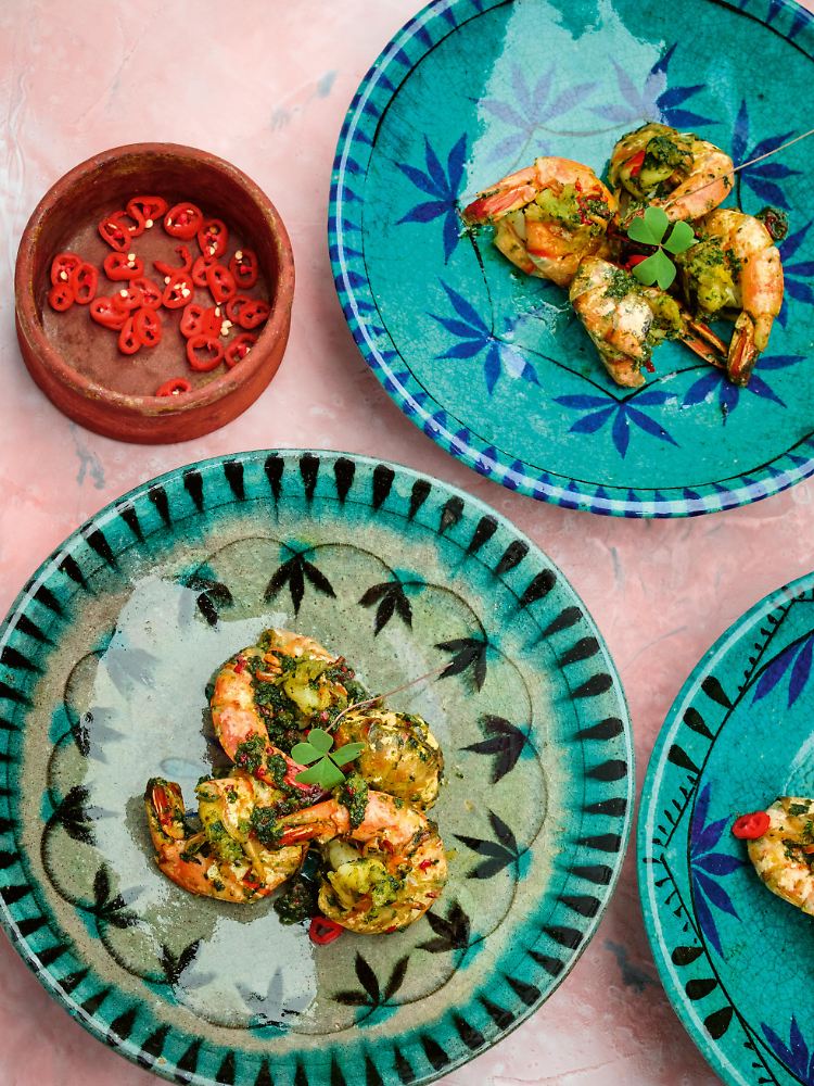 Riesengarnelen angebraten in einer Chili-Knoblauch-Koriander-Paste (Shahmeygoo)