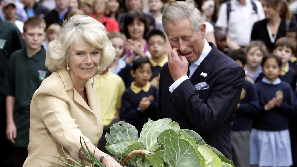 Charles, Prinz von Wales, und Camilla, Herzogin von Cornwall, zu Besuch bei Schrebergärtnern. Camilla bekommt zu ihrem Geburtstag einen riesigen Gemüse-Korb geschenkt. (Foto: picture-alliance/ dpa)