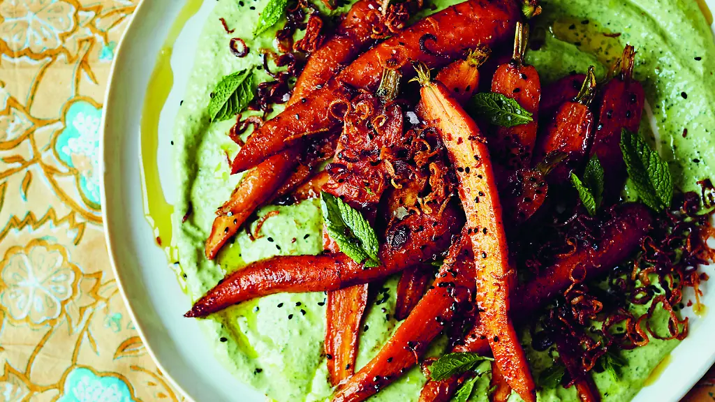 Geröstete Karotten mit grünem Joghurt und knusprigen Schalotten