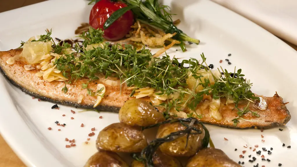 Lachsforellenfilet auf Kartoffel-Bärlauch-Püree mit Kressespuma