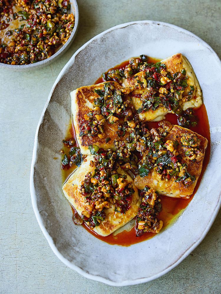 Käse und Oliven: Halloumi mit scharfen Oliven und Walnüssen