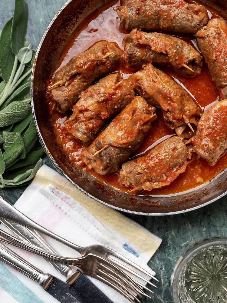 Useleti (oder oseleti) ist Dialekt und bedeutet "kleine Vögel" (uccellini auf Italienisch), denen diese kleinen Fleischrouladen ähnlich sehen sollen. Dies ist ein venezianisches Gericht aus der Zeit, als man kleine geschmorte Vögel aß, die mit Polenta serviert wurden. Useleti, auch useleti scampai genannt ("entflohene kleine Vögel" - obwohl ich vermute, dass sie wahrscheinlich bereits gefangen wurden, wenn sie im Topf sind!) werden traditionell aus dünnen Scheiben Kalbfleisch gemacht, die mit geräuchertem Schinken oder Bauchspeck und Salbeiblättern belegt und aufgerollt werden, bevor man sie in einer Sauce aus Wein, etwas Tomate und den austretenden Bratensäften in der Pfanne schmort. Die Anregung für dieses Rezept habe ich von meiner Tante Dina erhalten, die sie ähnlich zubereitet und noch Käse zur Füllung hinzufügt. Servieren Sie sie mit Polenta oder Kartoffelstampf mit Zwiebeln und Olivenöl, um die köstlichen Bratensäfte aufzunehmen.