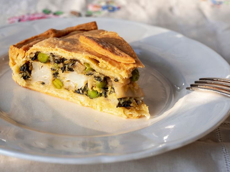 Diese vegetarische Tarte geht im Prinzip auf ein Rezept der Marchesa Eta Polesini zurück. Dafür wird verwendet, was sie "la famosa pasta speciale" (der berühmte Spezialteig) nennt, einen Allzweckteig für Anfänger, der nicht blindgebacken werden muss, was ihn, wie sie schreibt, besonders macht. Im Gegensatz zu den meisten Teigarten wird das Backpulver hier erst nach dem Ruhen in den Teig eingearbeitet. Ich ändere das Originalrezept ab und ersetze einen Teil des Weizenmehls durch Dinkelmehl, wodurch die Tarte einen nussigeren Geschmack und eine dunklere Farbe erhält. Dies ist ein hervorragender Teig, der sehr dünn ausgerollt werden kann. Für die Füllung werden Gemüsereste aus dem Kühlschrank oder der Speisekammer verwertet. Sie können das im Rezept angegebene Gemüse gern durch das, was Sie gerade vorrätig haben, ersetzen, nur die Mengen müssen grob dieselben bleiben. Marsala als Schmorflüssigkeit verleiht dem Gemüse eine schöne Süße.