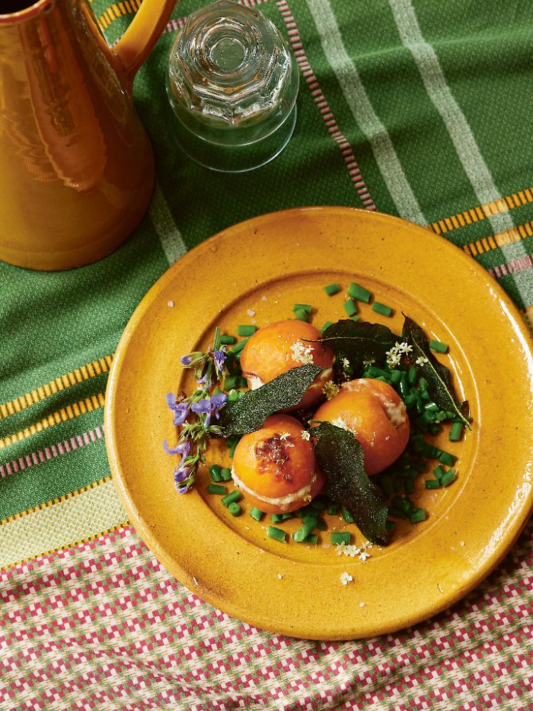 5. Die Bohnen auf Tellern anrichten, die Aprikosen daraufsetzen und mit dem gebackenen Salbei und frischen Holunderblüten garnieren.