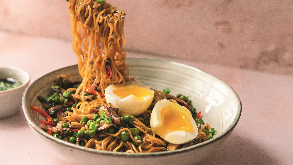 "Instant-Ramennudeln, Inbegriff der Low-Budget-Studiküche, haben einen schlechten Ruf: geschmacklich flach und nicht besonders nahrhaft. Ich jedoch habe Respekt vor ihnen und schätze sie aufgrund ihrer Schlichtheit und des nostalgischen Gefühls wegen, weshalb ich sie hier in ein völlig neues Gewand kleide. Dieses Gericht steckt voller Nährstoffe, und die Nudeln schmecken trotz minimalen Aufwands wie im gehobenen Restaurant."