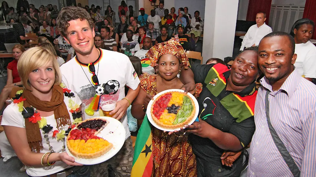 Fußball-WM-Spiel Deutschland - Ghana 2010: Im Gemeindesaal der evangelischen Lukaskirche in Frankfurt/Main schauen Fußballfans beider Länder gemeinsam zu. (Foto: imago stock&people)