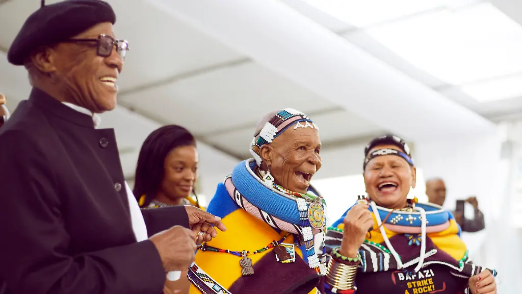 Auch hier am Iziko Museum hat die 88-Jährige die Vorderseite des Gebäudes bemalt. Die Besucher werden, wie bei ihr zu Hause, mit meisterhafter Abstraktion begrüßt. Für dieses Wandgemälde und die Eröffnung ist sie trotz ihres hohen Alters angereist. Sie selbst bleibt bei den Feierlichkeiten eher wortkarg und füllt dennoch den Raum. "Mam Esther", wie sie hier voller Respekt genannt wird, genießt den Augenblick. Als folkloristische Musik ertönt, tanzt sie rhythmisch in ihren lässigen Sneakern durch das extra aufgebaute Zelt. Die lebende Legende wird bis tief in die Nacht gefeiert.