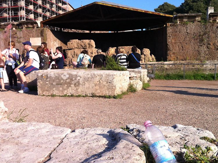 Am Ticketschalter heißt es, Essen sei auf dem Forum Romanum immer schon verboten gewesen. Das gelte in Museen in aller Welt. Trinken sei erlaubt. Folglich liegen hier und da leere Plastikflaschen zwischen Steinen aus der Römerzeit. Bei 40 Grad im Sommer sind stundenlange Besichtigungsmarathons ohne Getränk fast unvorstellbar.