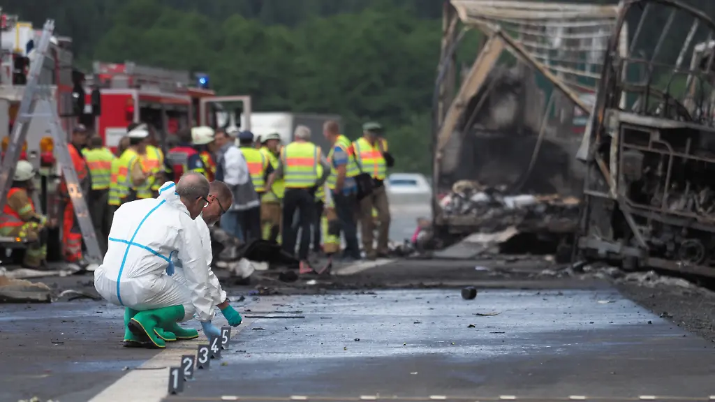Bereits die ersten Bilder von der Unfallstelle zeugen von der enormen Hitze des Feuers: Verkohlt und deformiert steht das ausgebrannte Wrack eines Reisebusses am rechten Fahrbahnrand der Autobahn A9 in Fahrtrichtung Süden. Bei einem der schwersten Busunfälle seit Jahren in Deutschland sind hier in Oberfranken auf der Höhe von Stammbach im Landkreis Hof im Inneren des Unglücksbusses mindestens 18 Menschen ums Leben gekommen.