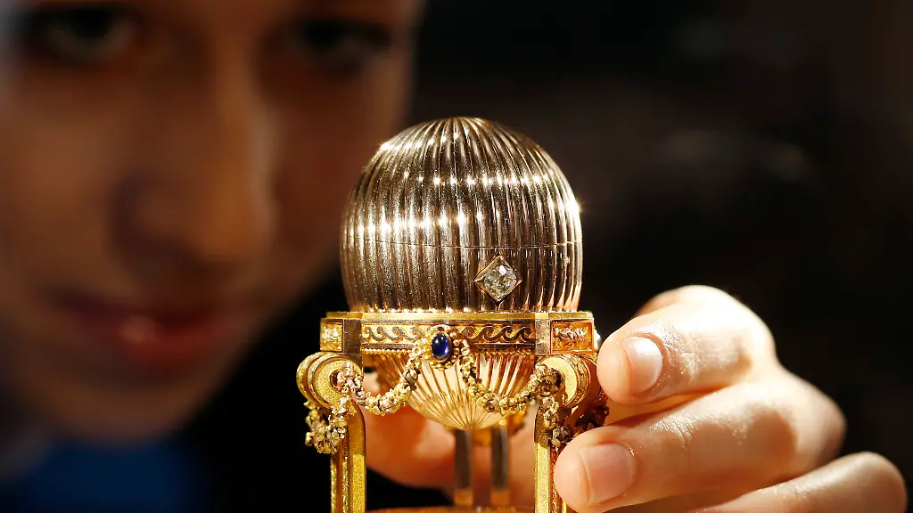 Währendessen steht das sündhaft teure Zaren-Ei vor ihm auf dem Tisch. Es ist überraschend klein - nicht größer als ein Hühnerei und thront auf einem reich verzierten goldenen Ständerwerk. Im Inneren befindet sich eine ebenfalls goldene Uhr. Jedes der Eier, die Zar Alexander seiner Frau schenkte, enthielt so eine kleine Überraschung.