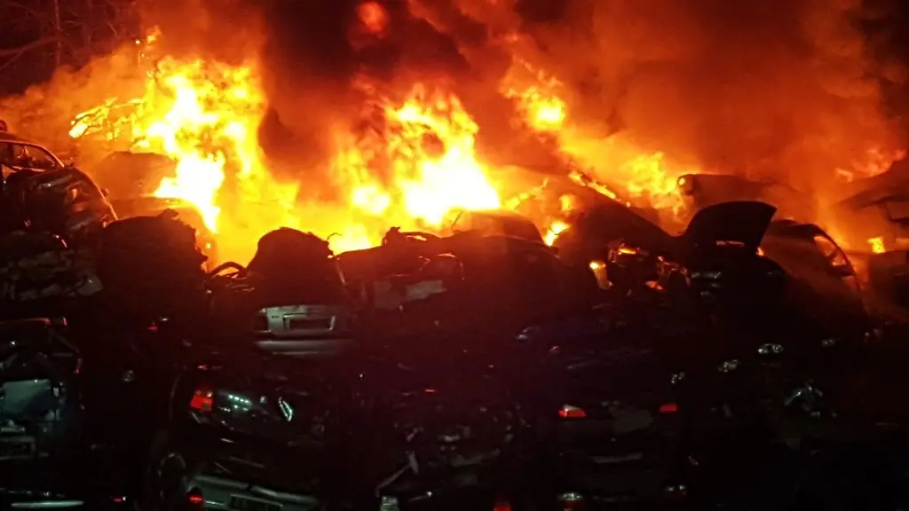 Zunächst war in einer Mitteilung von einer deutlich größeren Menge brennender Autos die Rede gewesen. Die Polizei korrigierte die Zahl der schrottreifen Fahrzeuge, die teilweise bereits gepresst und aufeinandergestapelt waren.
