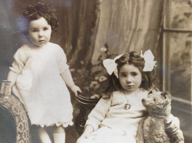Auf dem Schwarzweiß-Foto sind zwei Mädchen mit dem Teddybären zu sehen. Auf der Rückseite steht eine handschriftliche Notiz an "unseren Schatz Daddie" von "deiner liebenden kleinen Tochter und Sonia". Unterschrieben ist die Notiz mit dem Namen Dora. Aus der Karte geht auch hervor, dass der Teddy wahrscheinlich Glyn heißt.