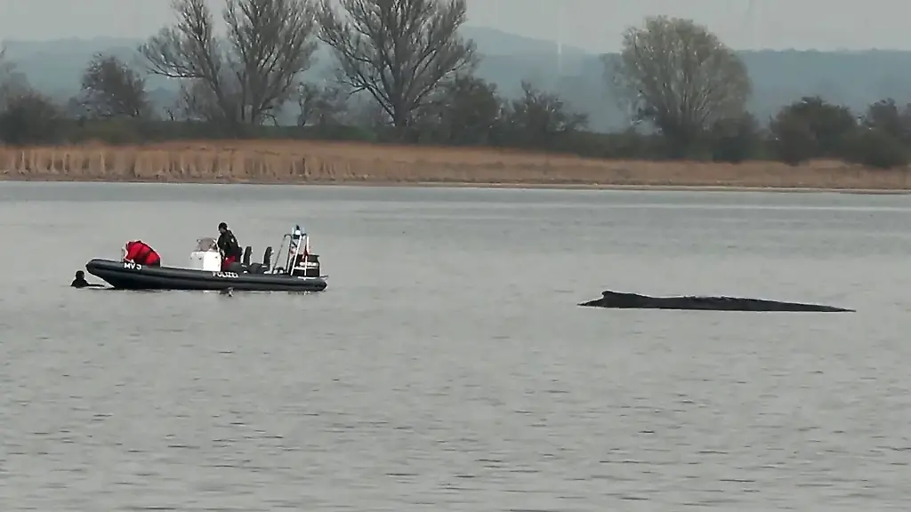 In der Nähe des gestrandeten Buckelwals hat die Polizei am Sonntagabend eine Schwimmerin aus dem Wasser geholt. Sie sei nach derzeitigen Erkenntnissen zuvor von einer Fähre in die Ostsee gesprungen, sagte eine Polizeisprecherin. Die Frau habe einen Neoprenanzug getragen. Es werde geprüft, ob rechtliche Konsequenzen folgen. "Es ist kalt im Wasser - auch mit Neopren", mahnte die Polizeisprecherin.