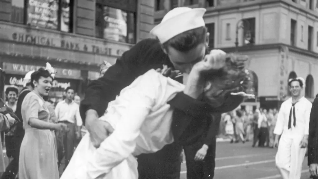 Es stellte sich nach einigem Streit heraus, dass es sich um George Mendonsa und Greta Friedman handelte, Mendonsa war Quartiersmeister bei der Marine und mit seiner zukünftigen Frau auf dem Times Square. Im Überschwang schnappte er sich wildfremde Frauen und küsste sie. So auch Friedman, die 1938 vor den Nazis aus Deutschland geflohen war. Eisenstaedt, der damals für das Magazin "Life" unterwegs war, nahm innerhalb von zehn Sekunden vier Fotos auf. Später sagte er über diesen Moment: "Hätte sie ein dunkles Kleid angehabt, hätte ich das Bild nie aufgenommen. Wenn der Seemann eine weiße Uniform getragen hätte, wäre es das Gleiche gewesen."