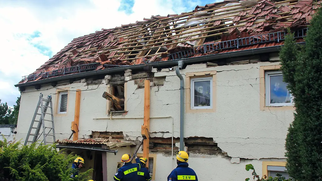 Ein Holzstamm ragt aus dem Fenster, das Dach des Hauses wird fast vollständig abgedeckt, und die Wände reißen auf: In Weinböhla bei Dresden explodiert ein Einfamilienhaus. Eine Frau wird dabei schwer verletzt.