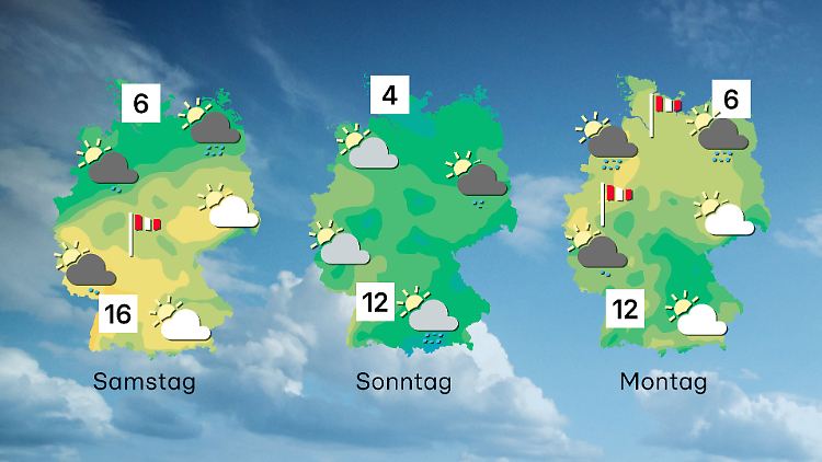 Bis zu 16 Grad sind am Samstag am Oberrhein und Neckar im Südwesten drin. Das fühlt sich frühlingshaft an und sieht auch so aus, denn die Sonne scheint dazu. Werte zwischen 10 und 15 Grad kann es in der Südosthälfte bis nach Köln, Göttingen, Berlin und Frankfurt/Oder geben. An der Donau und in den Tälern Ostbayerns bleiben die Werte bei rund 6 bis 9 Grad hängen. In der Nordosthälfte wird es auch nicht wärmer, dazu ist es grau mit Regen.