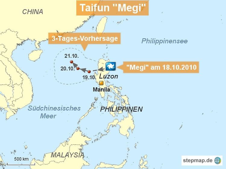 Der philippinische Wetterdienst gab Sturmwarnungen für 30 Provinzen und die Hauptstadt Manila heraus. Nach Behördenangaben zeichnen sich große Ernteverluste für die Bauern ab. "Megi" war gegen Mitternacht in den Bergen der Region Isabela auf Land getroffen. Der Taifun schwächte sich bei seinem Zug durch das Gebirge auf Windgeschwindigkeiten von rund 180 bis 215 Kilometern pro Stunde ab.