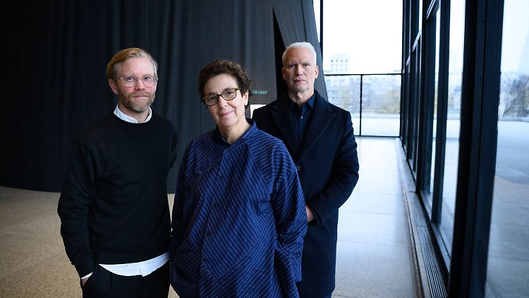 Fredrik Liew (l-r), Chefkurator des Moderna Museet in Stockholm und Kurator der Ausstellung, Ausstellungs-Architektin Hala Wardé und Klaus Biesenbach, Direktor Neue Nationalgalerie, in der Neuen Nationalgalerie, wo die Fotos von Nan Goldin als Slide-Show gezeigt werden.