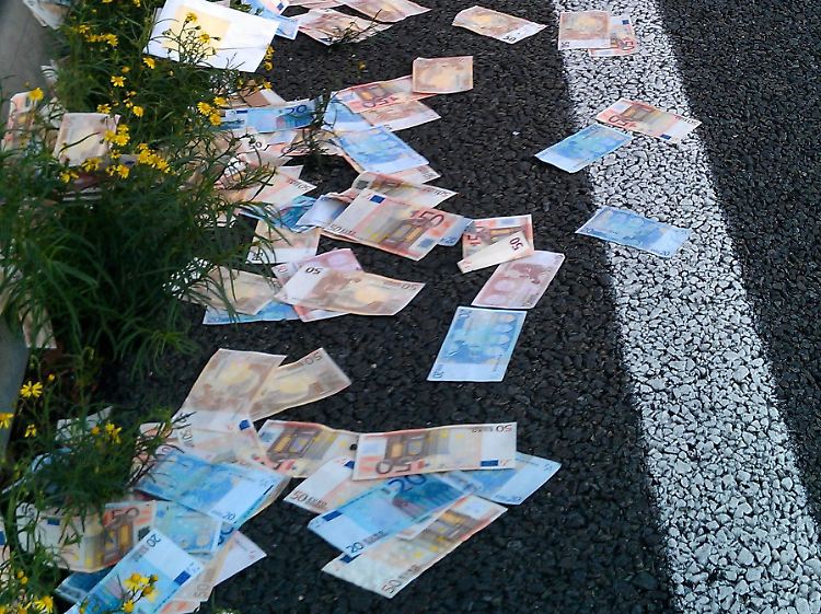 Ein überraschender Geldregen hat den Verkehr auf einer Autobahn im Süden der Niederlande zeitweilig lahmgelegt. Mehrere Fahrer hielten an und "halfen" beim Einsammeln von 50-, 20- und 10-Euro-Scheinen, teilte ein Polizeisprecher mit. Aus noch unklaren Gründen war die Tür eines Geldtransporters aufgesprungen und eine Kiste mit Banknoten auf die Straße gefallen.