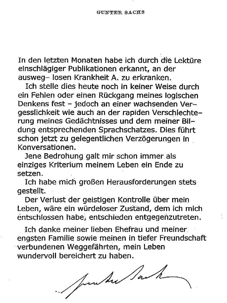 "Er war eine einmalige Persönlichkeit, die stets gradlinig und mit Herz für seine Familie und Freunde da gewesen ist", heißt es in der Mitteilung, die im schweizerischen Gstaad verbreitet wurde, wo Sachs unter anderem ein Haus besaß. Er habe erkannt, dass er "an der ausweglosen Krankheit A." erkrankt sei, schrieb Sachs in dem Abschiedsbrief, der der Nachrichtenagentur dpa vorliegt. "Der Verlust der geistigen Kontrolle über mein Leben wäre ein würdeloser Zustand, dem ich mich entschlossen habe, entschieden entgegenzutreten", heißt es in dem Brief, der von Gunter Sachs unterschrieben worden ist.