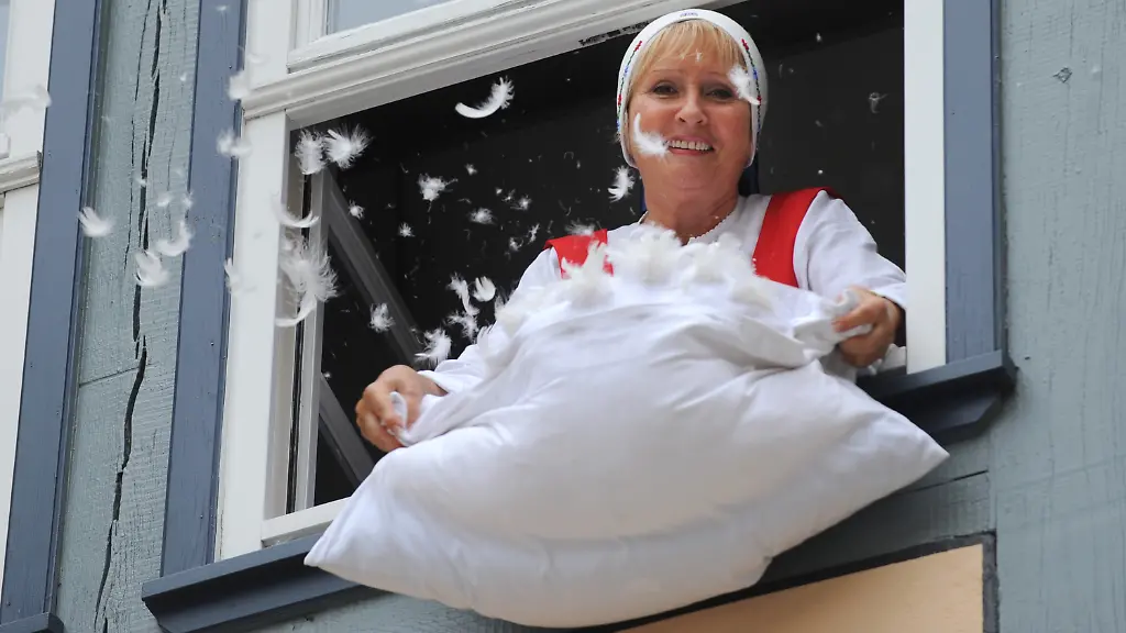 Als "Frau Holle" verkleidet schüttelt Marlu Stoffels aus einem Fenster des neuen Frau-Holle-Museums in Hessisch Lichtenau ihr Kissen aus. (Foto: dpa)