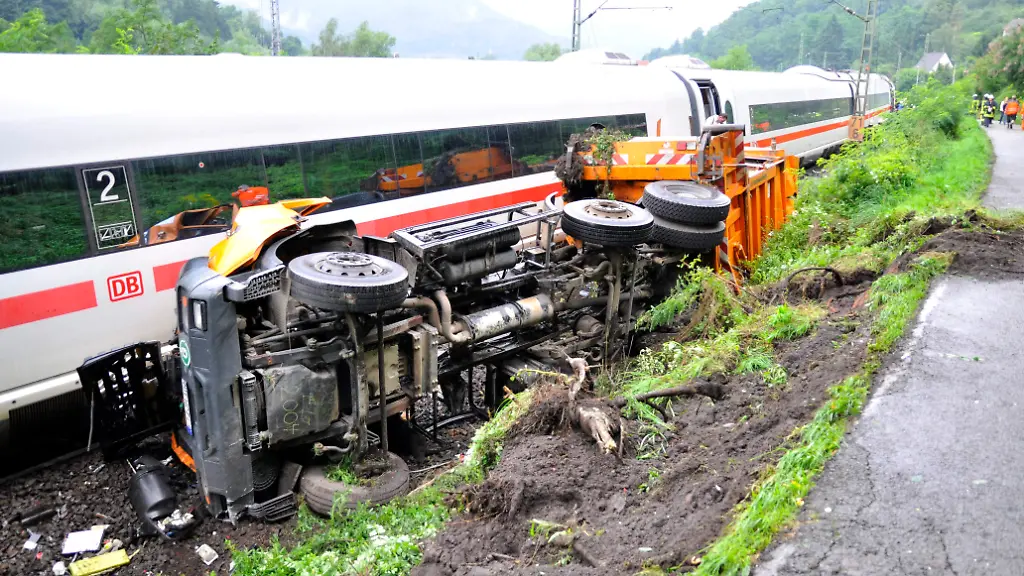 Beim Zusammenstoß eines ICE mit einem Müllfahrzeug sind im Pfälzerwald bei Lambrecht nach jüngsten Angaben zehn Menschen verletzt worden, einer von ihnen schwer. Nach Angaben der Bundespolizei war das Müllfahrzeug von einem schmalen Weg an die ICE-Strecke gerutscht. Ein Hochgeschwindigkeitszug auf dem Weg von Frankfurt nach Paris streifte den Wagen und schleppte ihn wohl ein Stück mit. Nach einigen hundert Metern kam der ICE zum Stehen, ein Waggon entgleiste. 320 Menschen waren an Bord des Zuges.