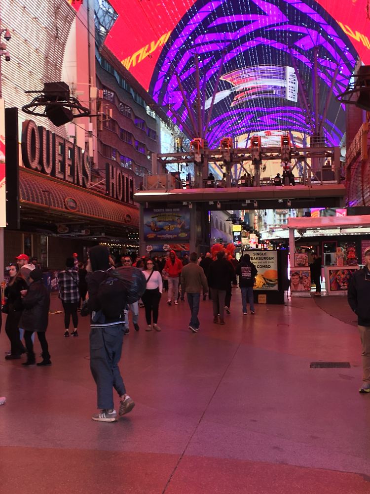 Grelle Lichter und LED-Bildschirme bilden eine gewölbte Decke. Darunter herrscht Super-Bowl-Ausnahmezustand: Musikerinnen rocken leicht bekleidet, Football-Fans geben sich am Tag vor dem großen Spiel in bunten NFL-Trikots die Kante und lassen die Selfiesticks tanzen. Alles ist riesig, protzig, luxuriös. Touristen gleiten an Seilen hoch unter der Decke längs durch die Kommerzmeile.