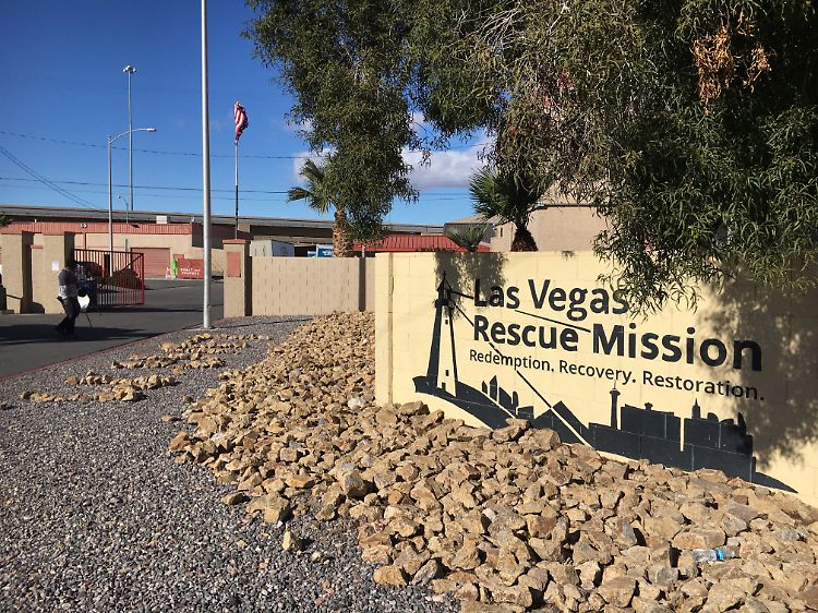 In der Innenstadt kommt die absurde Kombination von Reichtum und Leid zustande, weil rund fünf Gehminuten von der Kommerzmeile die Las Vegas Rescue Mission liegt, einer der wichtigsten Anlaufpunkte für Obdachlose und Hungerleidende in Las Vegas. Trotz der geografischen Nähe sind Super Bowl, Glitzer und Trubel hier ganz weit weg. Abgesehen von wenigen Obdachlosen ist hier niemand auf der Straße unterwegs. Die schneebedeckten Berge in der Ferne könnten fast für einen malerischen Moment sorgen, wenn nicht die Armut allgegenwärtig wäre. Der Weg führt an einer Schnellstraße entlang durch eine verwahrloste Autobahnunterführung. Heruntergekommene Zelte und Matratzen am Straßenrand dienen als Schlafplätze.