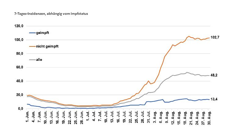 Schleswig-Holstein veröffentlicht zwar noch nicht regelmäßig nach Impfstatus getrennte Werte, aber man erhält sie beim Sozialministerium auf Anfrage. Am 30. August zählte das Bundesland 48,2 Neuinfektionen pro 100.000 Einwohner und Woche (aktuell 49,5). Die Inzidenz der geimpften Einwohner betrug 13,4, die der ungeimpften Bevölkerung 102,7. Damit ist der Wert rund achtmal höher.