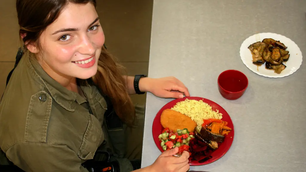 Sojaschnitzel mit Mais, Reis, rote Beete, Süßkartoffeln und Salat: Daniela Joeli sitzt vor ihrem Teller in der Kantine der Militärbasis am Kontrollpunkt Makkabim zwischen Israel und dem palästinensischen Westjordanland. Ihre schwarze M16-Maschinenpistole hängt über ihrer Schulter. Sie legt die Waffe auch beim Essen nicht ab. Die 19-jährige Israelin ist Kampfsoldatin - und Veganerin.