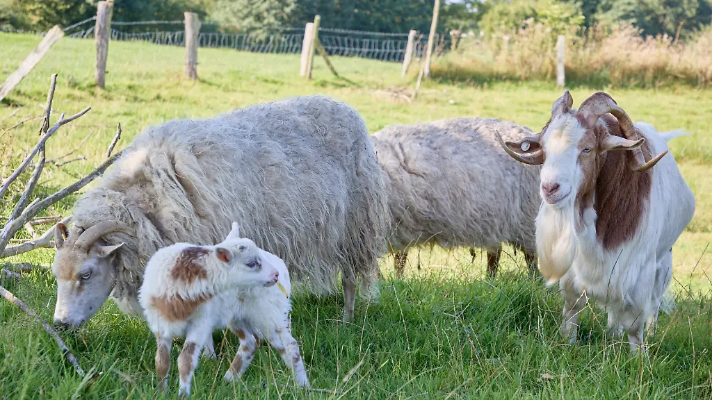 Flumo hat weißes Fell mit braunen Flecken - genauso wie Ziegenbock Rune, der seit Jahren mit einer kleinen Schafsherde auf der Koppel hinter dem Haus lebt. Der einzige Schafsbock in der Herde hat dunkles Fell. Der kleine Bock ist geboren worden, als auf dem Hof das Flugmodus-Festival veranstaltet wurde. Daher war der Name für den Nachwuchs schnell klar: Flumo.