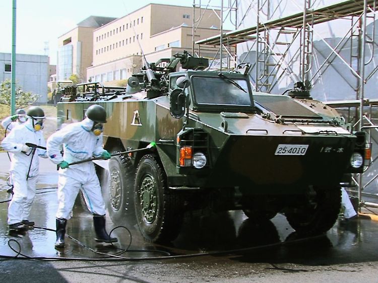 Am Rande der Evakuierungszone waschen japanische Soldaten ein Panzerfahrzeug, um es zu dekontaminieren.