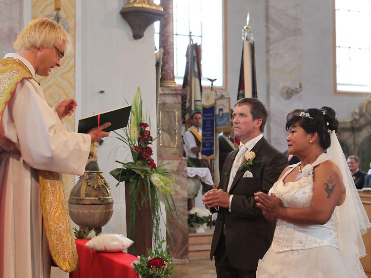 Nach der einstündigen Trauung durch Pfarrer Martin Klein ging es ins bayerische Festzelt. Bei Volksmusik gab es Leberspätzlesuppe, Spanferkel mit Semmelknödeln und Burgunderbraten. "Ich bin so glücklich. Vor einem Jahr haben wir uns kennengelernt und jetzt bin ich Josefs Frau. Ich kann es gar nicht glauben", freute sich Narumol. Gemeinsam wurde dann noch die siebenstöckige Hochzeitstorte angeschnitten. Nach einem alten Brauch wurde aber nur bis 23.30 Uhr gefeiert und getanzt.
