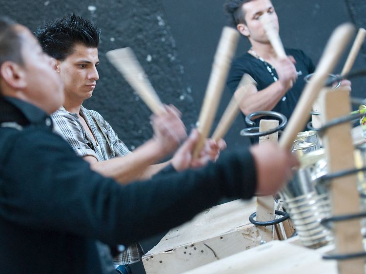 "Klassische Kulturangebote erreichen unsere Jugendlichen nicht", sagt Zaiser. Aber das Trommeln mit Alltagsmaterialien kommt an: Die Holztrommeln, groß wie Rednerpulte, hinter denen die Jugendlichen stehen, bauen die "Beatstomper" selbst. An der Seite hängen Autofederungen, Schilder, Dosen und alles, was irgendwie laut ist.