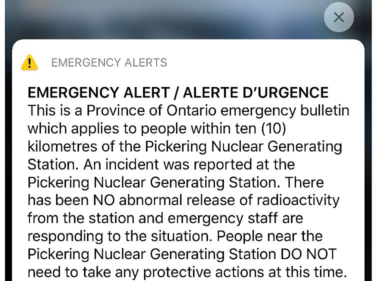 Eine irrtümlich versandte Warnmeldung löst in Kanada große Aufregung aus. Millionen Menschen erhalten bei einer Übung für den Notfall einen Hinweis auf einen angeblichen nuklearen Störfall. Erst geraume Zeit später gibt der Betreiber Entwarnung.