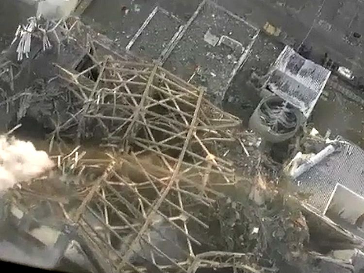 Der Screenshot eines Videos, das am 17. März von Tepco veröffentlicht wurde, zeigt das stark beschädigte Gebäude von Reaktor 1.