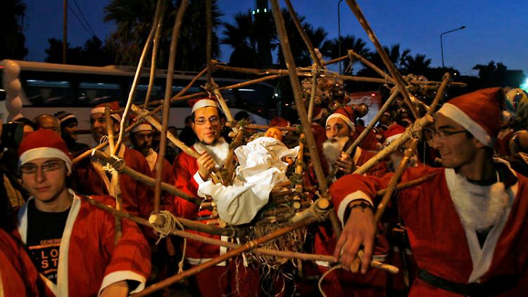 Syrische Jugendliche tragen eine Krippe mit Jesusfigur durch Damaskus. Das Bild entstand am 23. Dezember 2008.