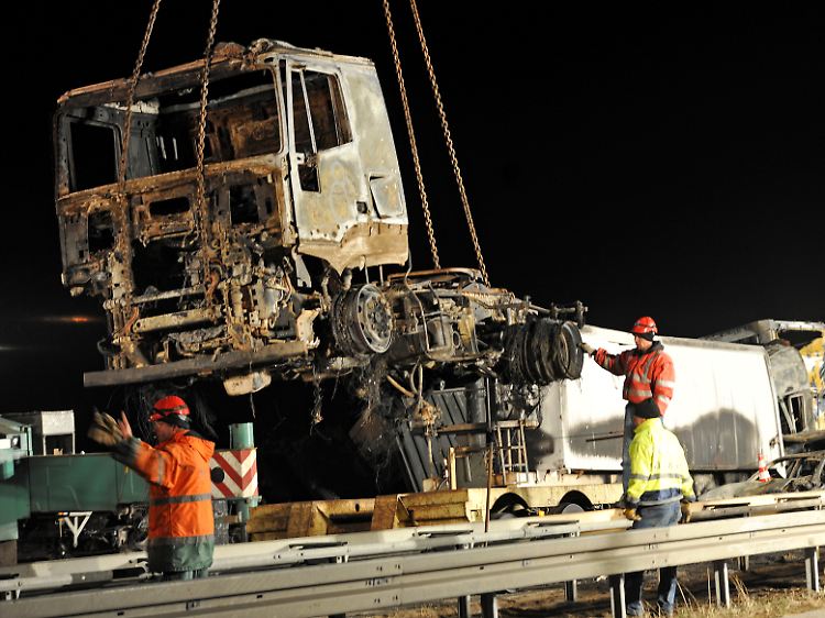 Etwa 20 Stunden nach dem Massencrash war auch der letzte brennende Lastwagen gelöscht. Dichter Löschschaum bedeckte den Boden um den letzten völlig ausgebrannten Lkw. Das Wrack stand schräg im Graben. Die Fahrbahn war auf Dutzenden Metern mit riesigen Löchern übersät und völlig schwarz von Ruß und verbrannten Wrackteilen.