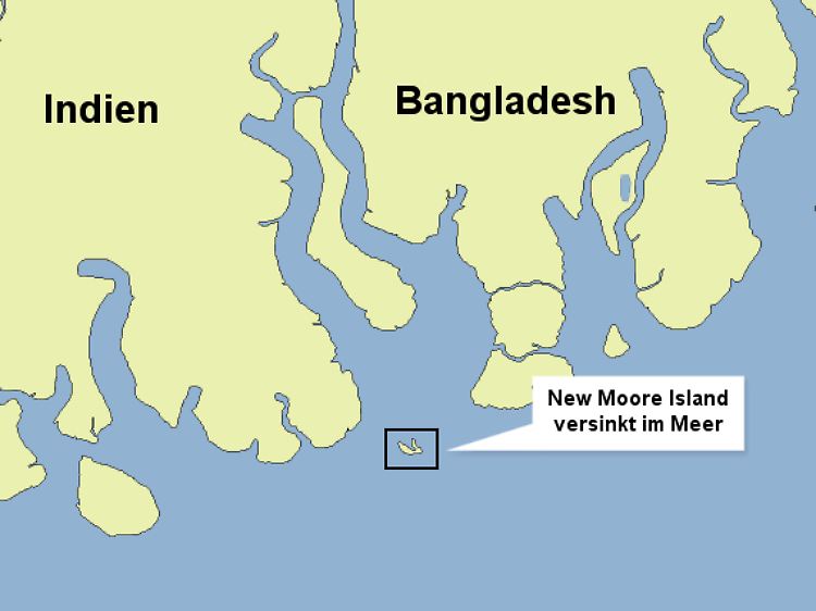 Der Klimawandel hat einen Konflikt zwischen Indien und Bangladesch um eine von den beiden Ländern beanspruchte Insel gelöst: Die Auswertung von Satellitenbildern habe ergeben, dass die Insel unter dem steigenden Meeresspiegel versunken sei, sagte der Direktor der Abteilung für ozeanographische Studien an der Jadavapur-Universität im ostindischen Kolkata, Sugata Hazra. Fischer hätten das Verschwinden der Insel bestätigt, die von Bangladesch South Talpatti und von Indien New-Moore-Insel oder Purbasha genannt wurde.