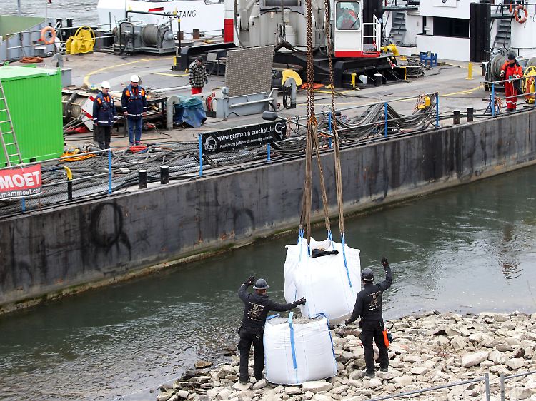 Die Einsatzkräfte haben bereits begonnen, den 1,8 Tonnen schweren Sprengkörper der Luftmine trockenzulegen. "Die ersten Big Bags sind gesetzt", sagte Thomas Weckop vom Wasser- und Schifffahrtsamt Bingen. Mit "Big Bags" sind große Sandsäcke gemeint, die jeweils eine Tonne wiegen. Sie sollen eine Staumauer bilden und die Bombe von ihrer Umgebung abschirmen.